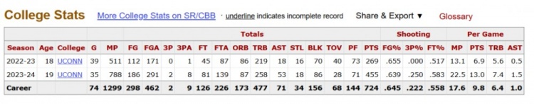 横向对比克林根大学两年和NBA两个赛季的数据,你会发现他的变化极其一致:第一年场均十几分钟的时间,7分6-8个篮板,坐不稳首发,爆犯力惊人,总体来说是个优缺点都很鲜明的蓝领中锋;第二年坐稳首发,各项数据全面飞跃,产效齐升,各种进攻技巧也得以充分展现,单场上双如探囊取物,成为外线队友们离不开的内线脊梁。