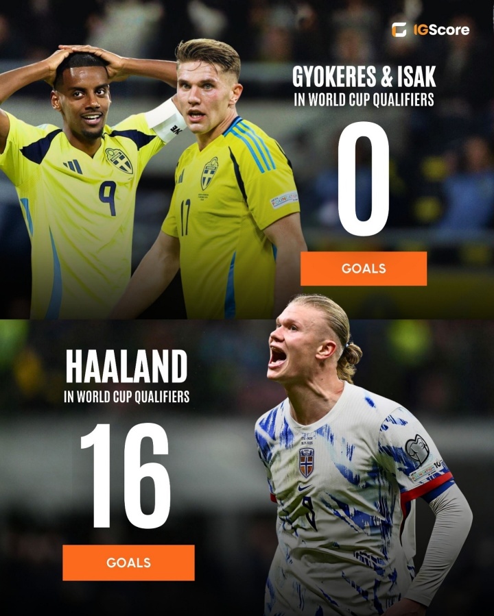 2025-11-19 00:03:14档次差距?哈兰德8场16球头名进世界杯,瑞典2.7亿锋线4场1球垫底