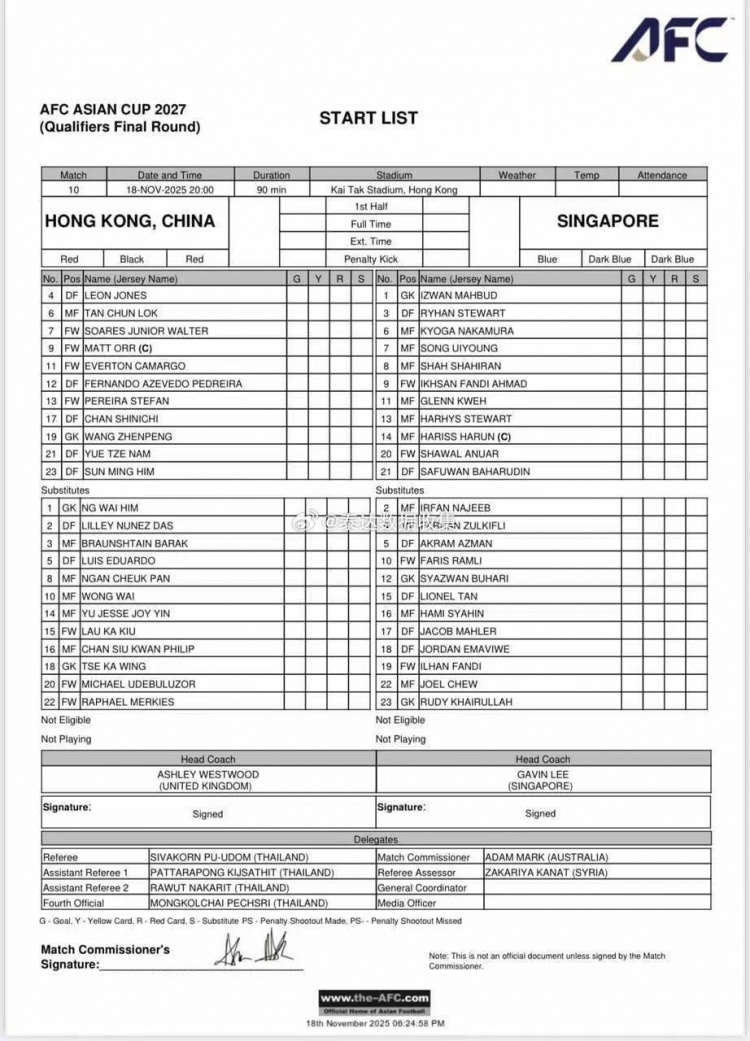 亚预赛出线关键战!中国香港vs新加坡首发:安永佳、陈晋一领衔