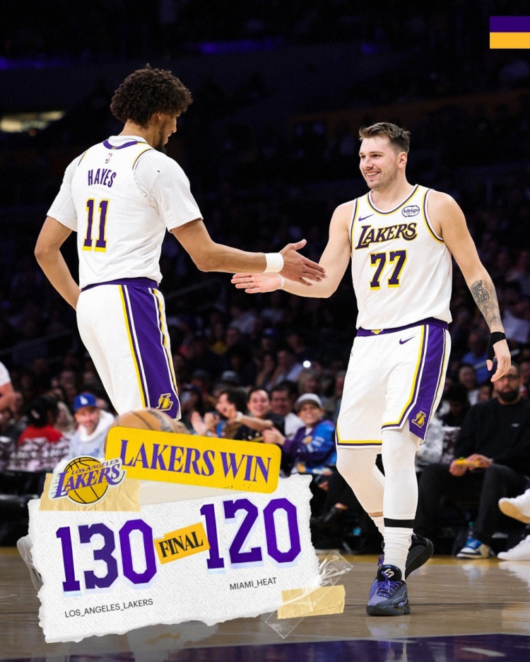 2025-11-03 19:24:40东契奇和海斯击掌庆祝!湖人晒赢球海报:今晚洛杉矶很吵
